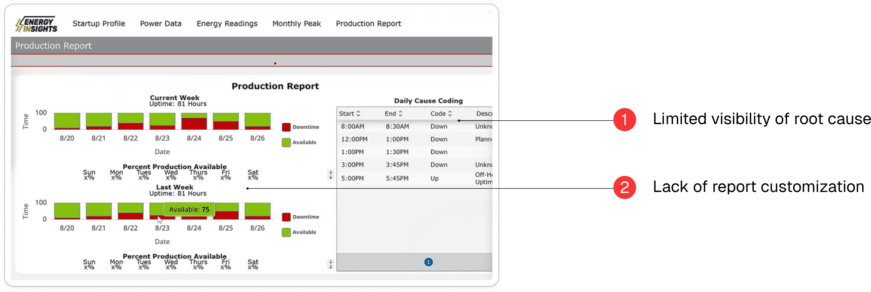 The production report lacks customizable views and fails to capture contextual factors behind machine idle time. Users cannot correlate downtime with variables like temperature, feed rate, or shift patterns, making root cause analysis and performance optimization difficult.